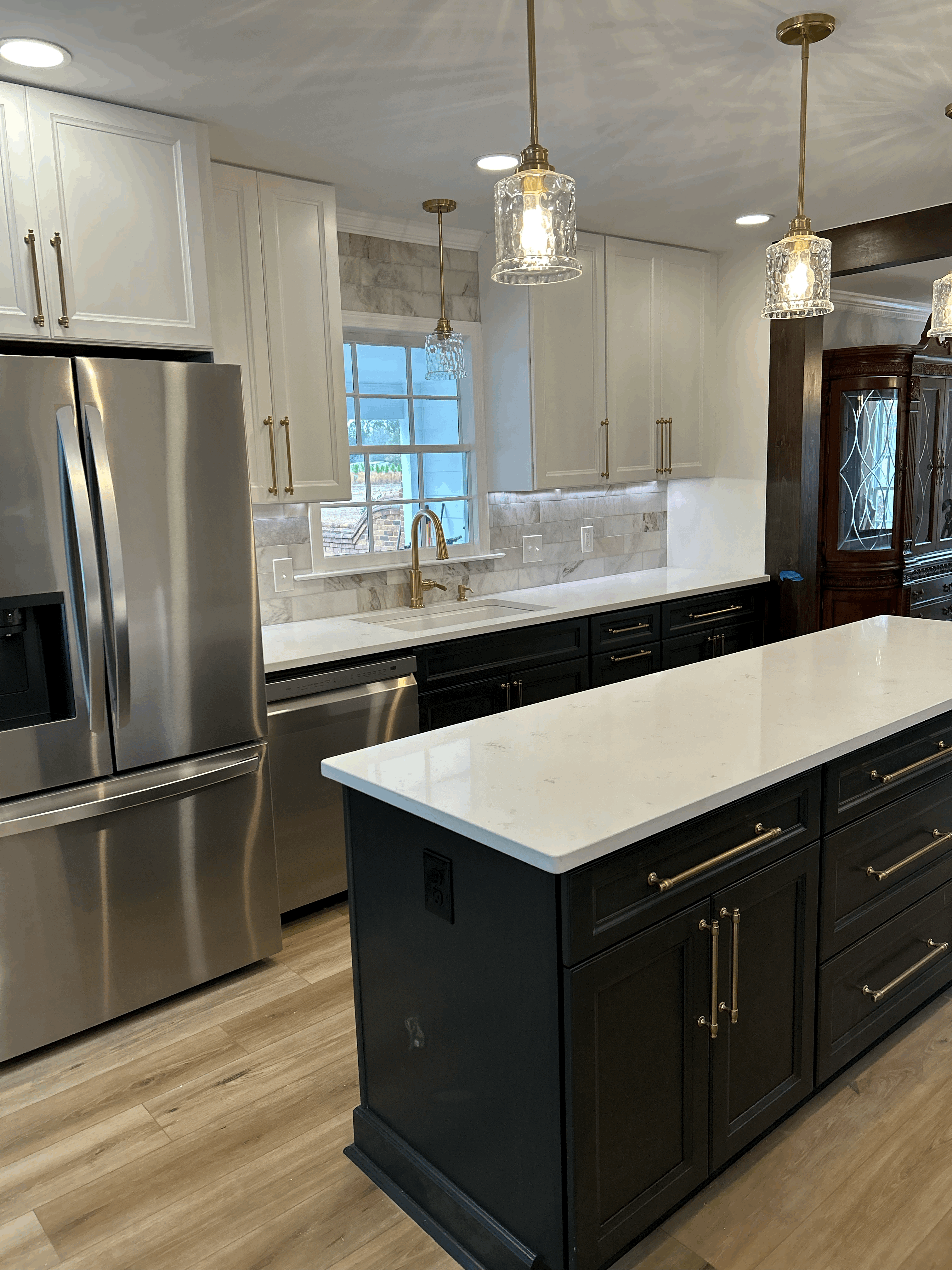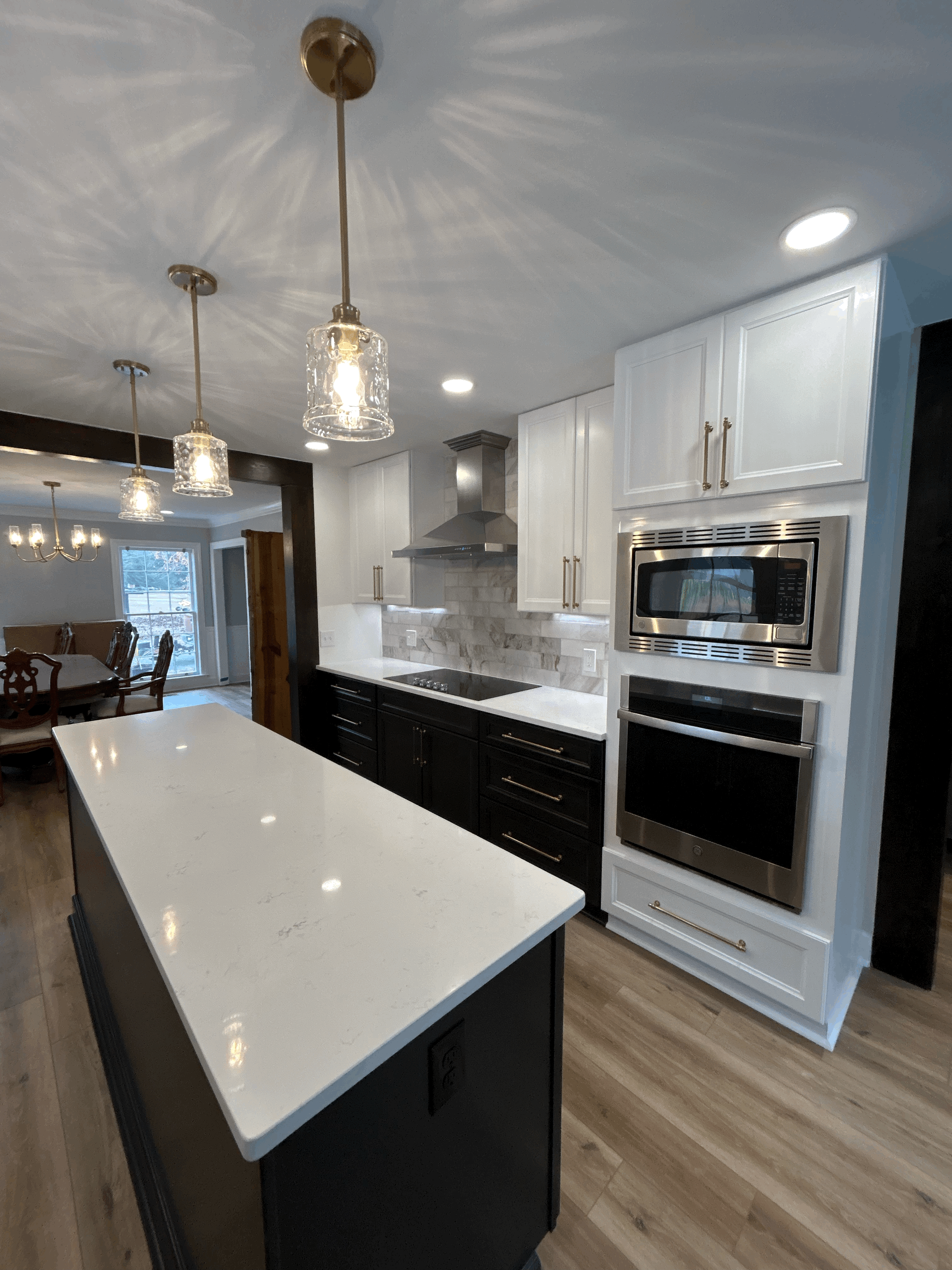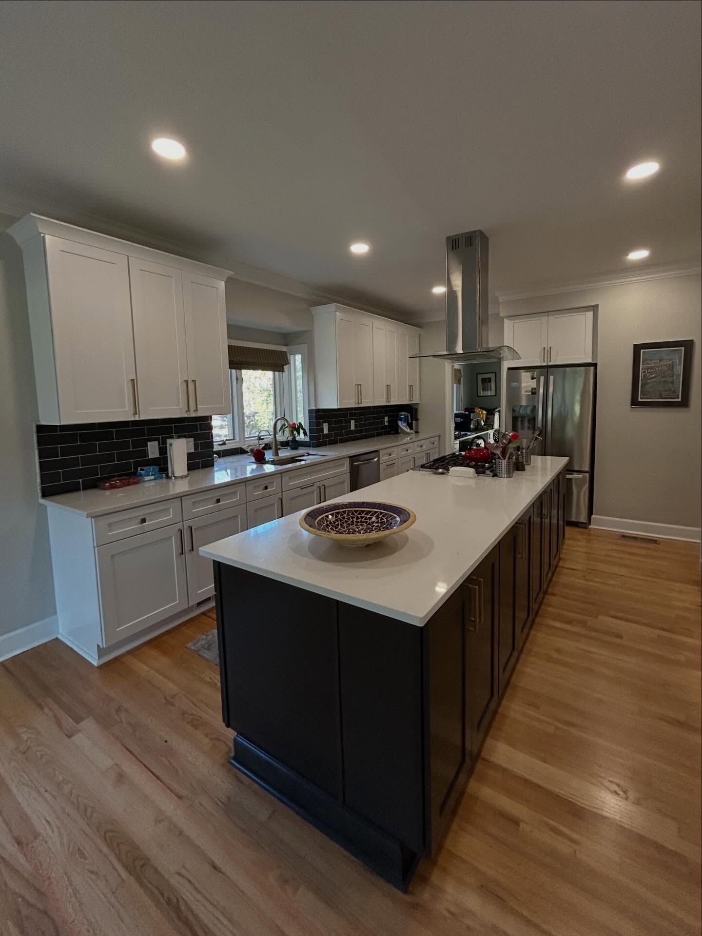 Our team transformed the space into a bright, functional centerpiece of the home by installing full-height custom cabinetry, a statement island with contrasting finishes, and sleek quartz countertops that bring both durability and elegance. We incorporated a modern tile backsplash, upgraded lighting throughout, and a professional-grade vent hood to create a clean, contemporary aesthetic while maximizing usability.